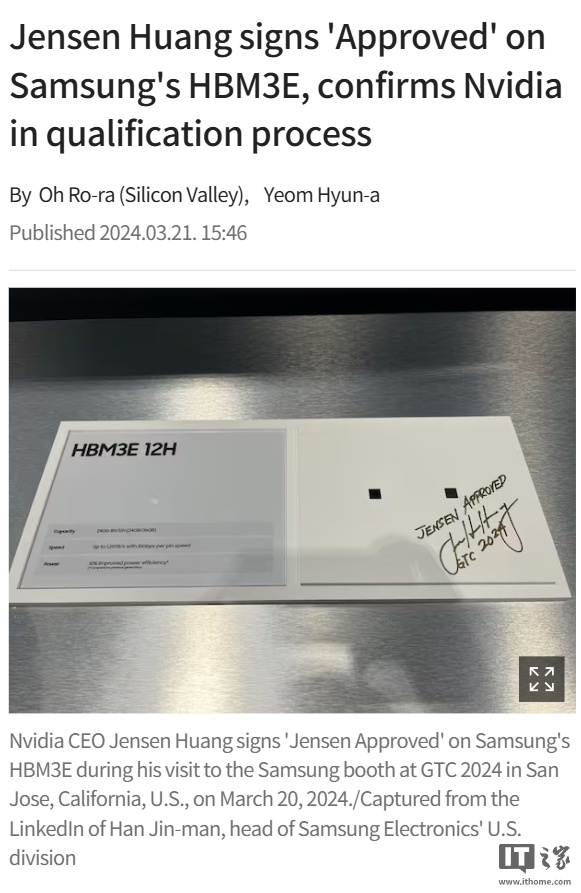 本次消息与三星首次被传出入选英伟达供应链距离 1 年 7 个月,去年 3 月举行的 NVIDIA GTC 2024 大会上,黄仁勋曾亲自给予三星“老黄认证”,在展示的 HBM3E 样品中签下“Jensen Approved”(IT之家注:黄仁勋认可),但随后三星在英伟达的质量测试中屡屡受挫。
